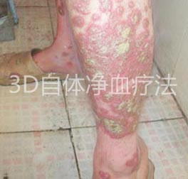 四肢不同程度的泛发黄色脓疱,并汇合成大片的脓池,尤其是双腿,覆盖一层厚厚的脓痂,周围皮肤红肿,且有新出的脓疱。 |