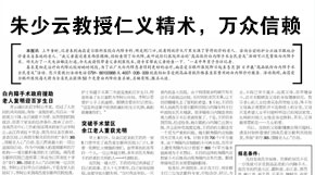 朱少云教授对医术精益求精,视名利淡如水。来院看病的患者,相当多都是看过很多次的"老病号",这些患者往往在别的医院求治未果,病情不断加重来院治疗的。他用精湛的技术和高度的责任心创造了许多奇迹,赢得了患者的信赖和尊重。